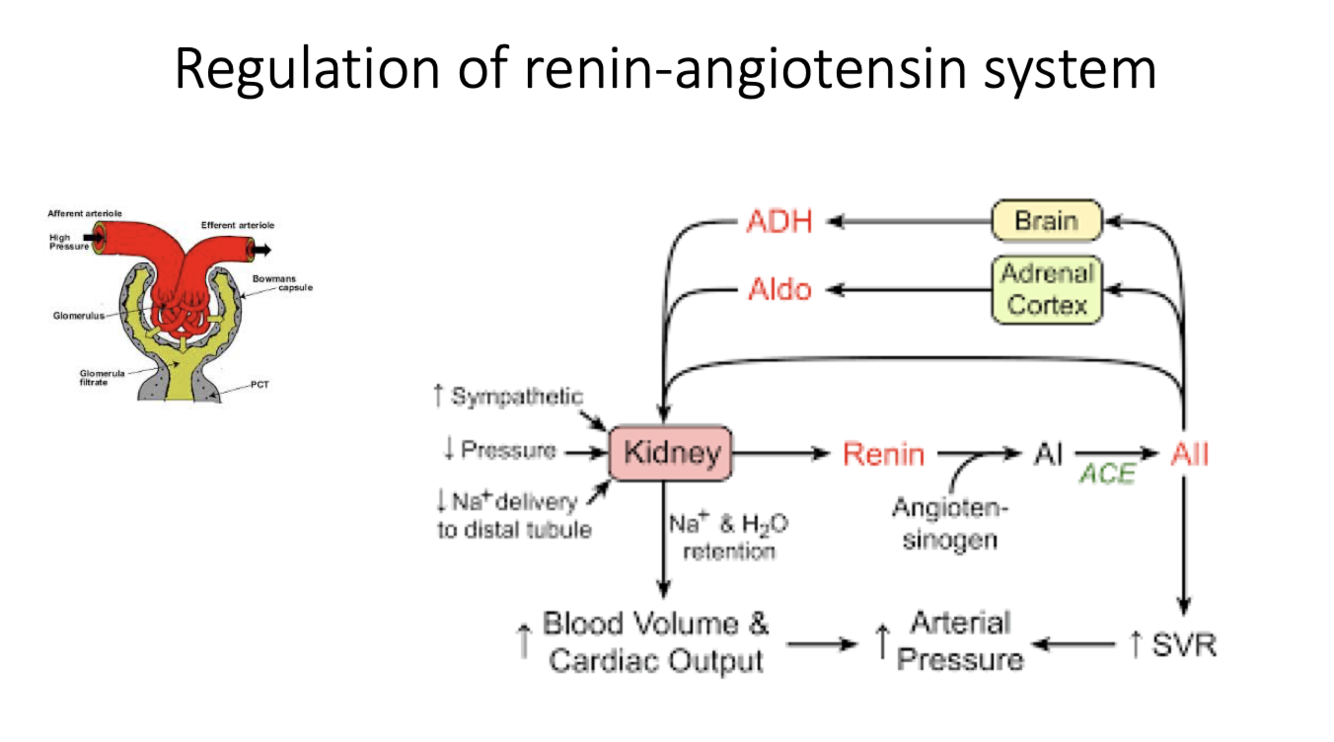 __ is secreted by JG cells in response to decreased renal perfusion pressue (detected by renal baroreceptors in the afferent artiole), increasing renal sympathetic discharge (beta 1 efect), and decreasing NaCL delivery to the macula densa cells