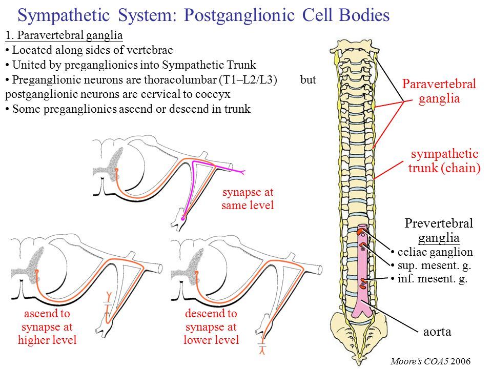 All pre-ganglionic sympathetic neurons can synapse in […] ganglia.