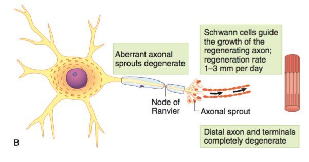 the Schwann cell doesn’t degenerate, which provides a scaffold for regeneration and remyelination of the axon