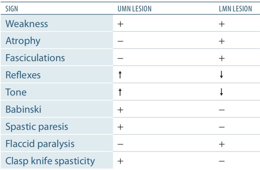 lower motoneuron = everything down (tone, DTRs, toes)