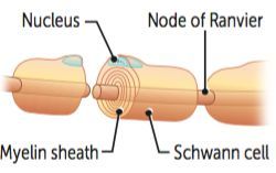 At the nodes of Ranvier, there is a high concentration of Na+ channels.