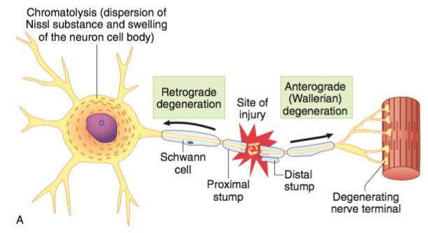 In response to axon damage, the neuron cell body undergoes chromatolysis (“axonal reaction”), which is the swelling of the cell body and dispersion of Nissl substance.