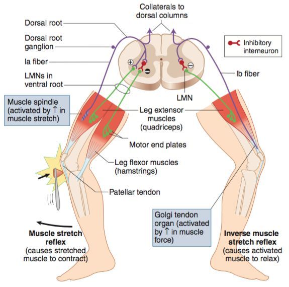 In the muscle stretch reflex, some Ia afferent fibers inhibit antagonist muscles (agonist or antagonist) through interneurons causing muscle relaxation.