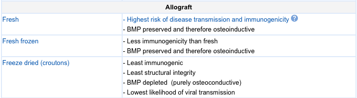 Osteogenic: Material directly provides celsl that will produce bone-inducing primitive mesenchymal stem cells, osteoblasts and osteocytes. Examples are: autologous bone graft (fresh autograft and bone marrow aspirate)