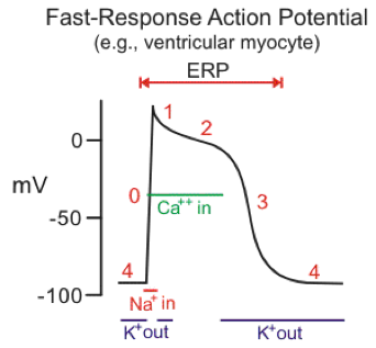 0. Depolarisation phase: Na+ in: positive feedback mechanism – more Na+ in causes more Na+ gates to open