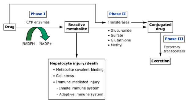 phase 1: CYP450 (1, 2, 3) enzymes oxidate, reduce or hydrolyse to make water sol.