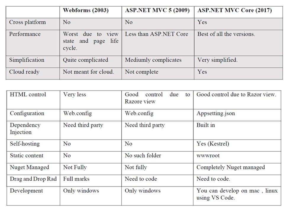 Can you explain the difference between MVC core vs MVC 5 vs Webforms?