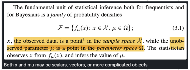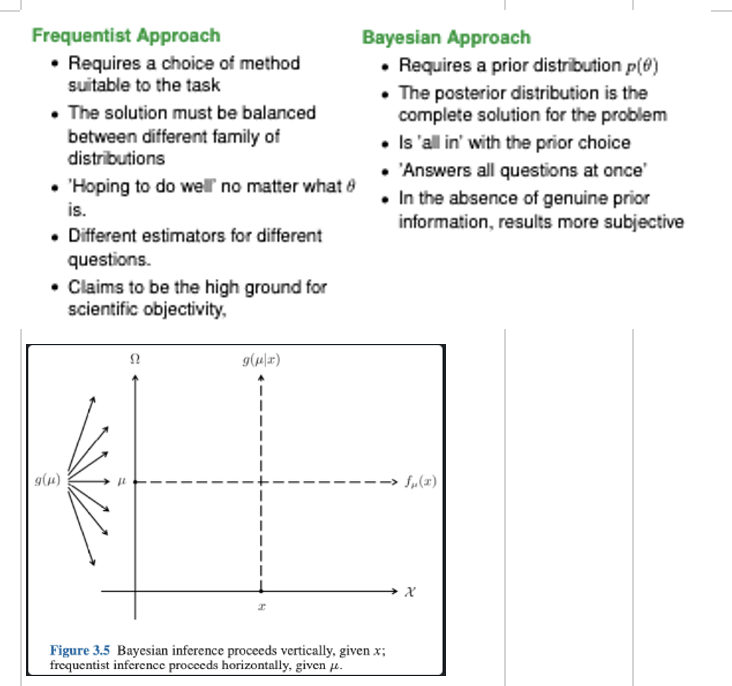 In Bayes’ formula (3.5), x is fixed at its observed value while mu varies over omega!! , just the opposite of frequentist calculations.