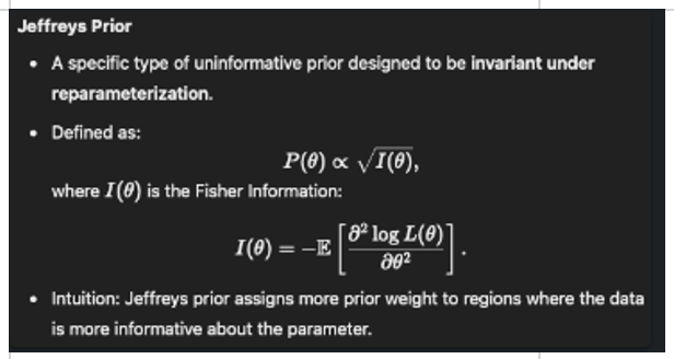 Example: For a parameter θθ in a normal distribution with known variance, Jeffrey’s prior is π(θ)∝1π(θ)∝1, reflecting no prior knowledge about the mean.”