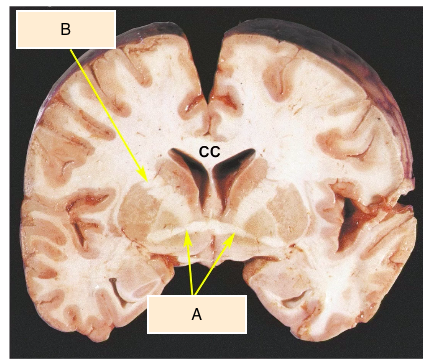 B = lenticular nucleus & thalamus