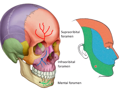 • opthamalic (V1): supraorbital foramen