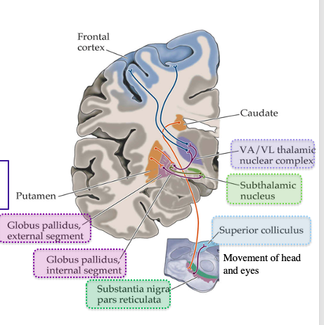 Neurons from substantia nigra pars reticula (SNr) synapse onto neurons in the superior colliculus (midbrain)