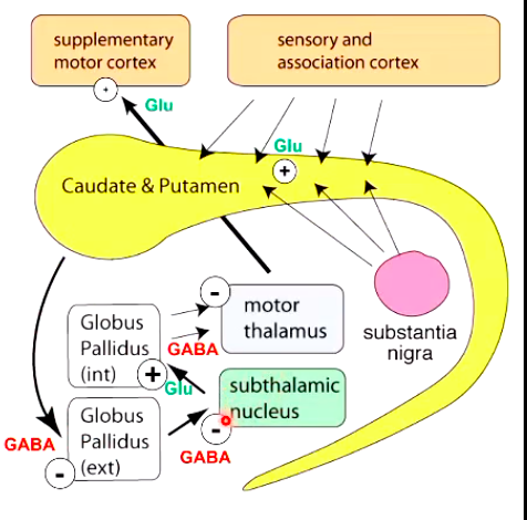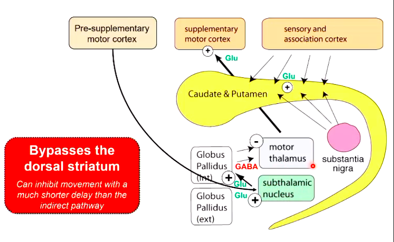 Signal from the pre-supplementory motor cortex bypasses the dorsal striatum and causes the release of glutamate (excitatory) onto subthalamic nuclei