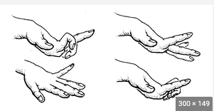 pill-rolling’ rest tremor; looks like you are trying to roll a pill between your thumb and index