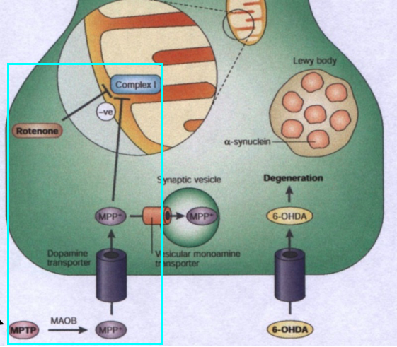 The compound MPTP is a toxin which can be transformed into the metabolite MPP+ which is neurotoxic for dopaminergic neurons