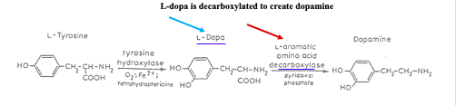 L-tyrosine –> L-Dopa (Decarboxylated to create..) –> Dopamine