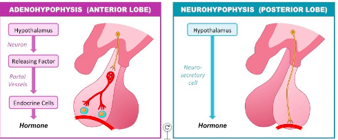 •Anterior lobe: Hypothalamic cell bodies have shorter axons that release peptides on to the capillary plexus in the neck of the pituitary stalk
