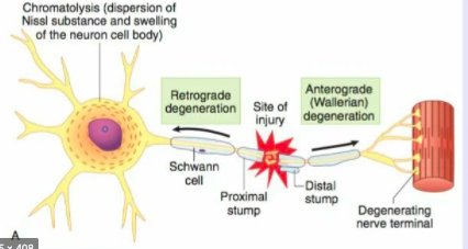 Wallerian degeneration is an active process of retrograde degeneration of the distal end of an axon that is a result of a nerve lesion. It occurs between 7 to 21 days after the lesion occurs. After the 21st day, acute nerve degeneration will show on the electromyograph.