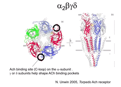 structure: α2βγð subunits; spans across inside of cell, cell membrane and outside of cell (where the binding sites are)