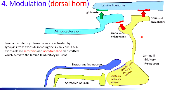 Explain the mechansim of pain modulation at the dorsal horn via the Noradrenaline and serotonin neurons
