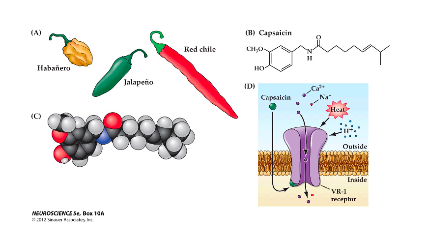 Capsaicin excites pain and heat rececptors; but then desensitization the receptors and reduces pain