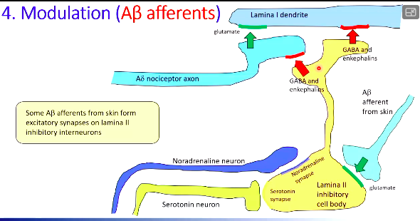 Ab afferent from skin also synapse excitably onto lamina II inhibitory cell body, that are used as interneurons from descending pain pathway (from noradrenaline and serotonin)
