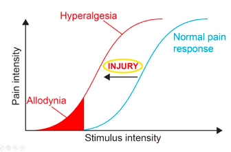 Allodynia: a condition where pain is caused by a non-noxious (non-painful) stimulus (e.g. tickle with a feather).