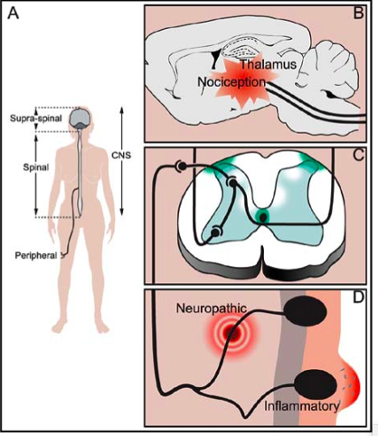 in the pain pathway at the peripheral and central (spinal and supraspinal) levels