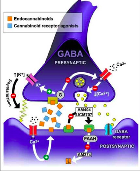 E.g. Activation of GABA receptor causes release of endocannabinoid, which goes retrogradly (to the pre-synaptic terminal) and decrease release GABA)