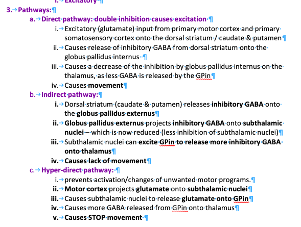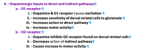 Describe the differences between D1 and D2 receptor inputs to the direct and indirect pathways