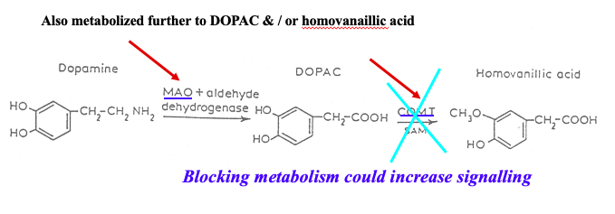 COMT is an enzyme involved in the breakdown of dopamine (DOPAC –> homovanillic acid) and hence may be used as an adjunct to levodopa therapy
