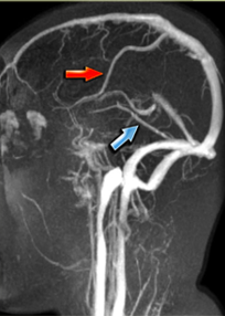 Red arrow = vein of Trolard (superior anastomotic vein)