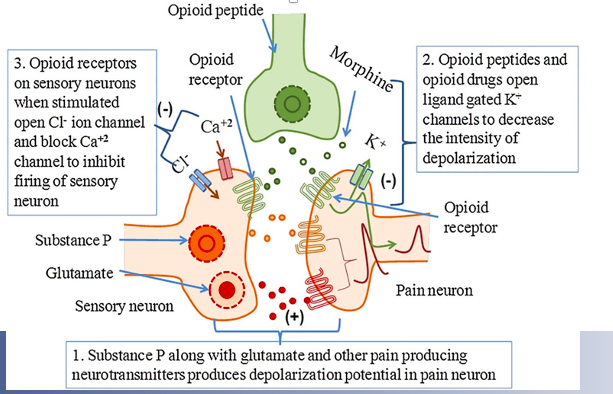 This inhibits release of glutamate and stops pain modulation