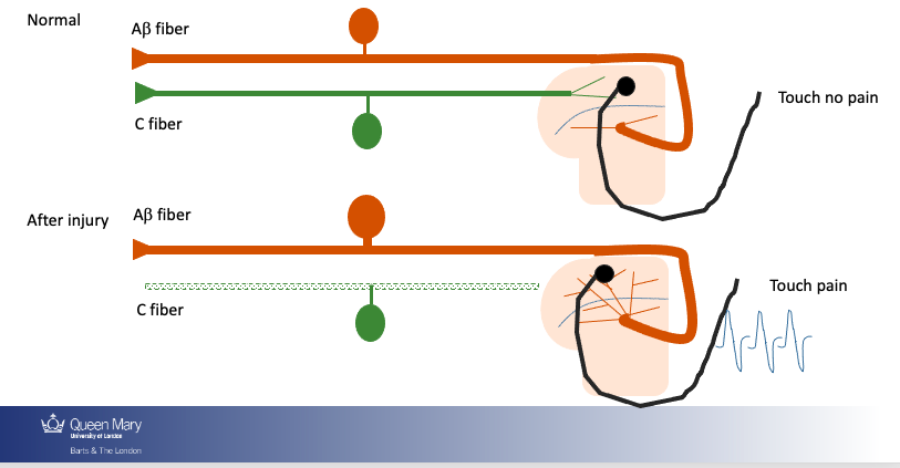 Abeta fibres (which dont normall cause paincan sprout in dorsal horn - which directly activates projection neurons which causes chronic pain