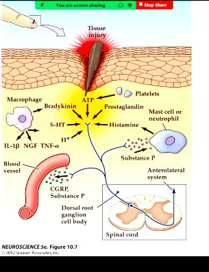 When there is an injury, there is receptor potential in the primary afferent and if the potential is big enough it will create an action potential and pain (via Na & Ca2+ channels)