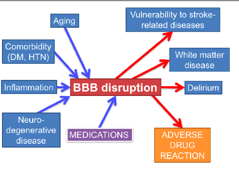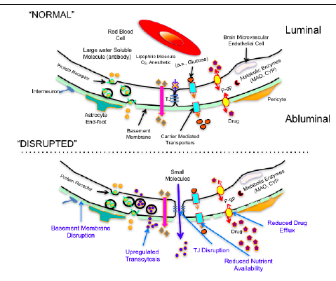 BBB under normal and disrupted (e.g. aging) conditions. Normally, the presence of tight junctions measn that passage of drugs must occur trans-cellularly.