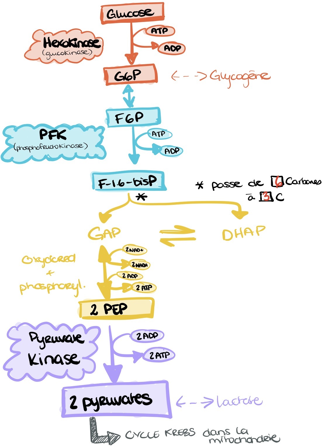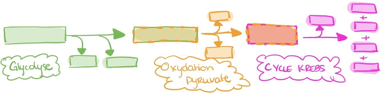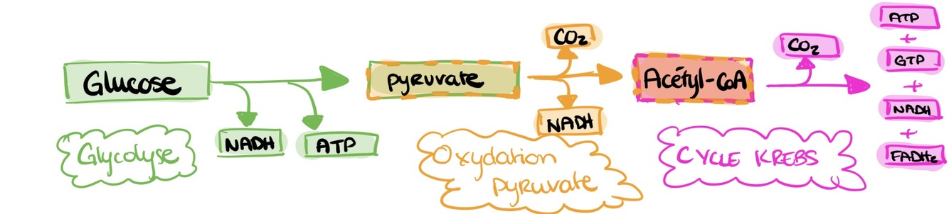 Substrats : glucose, pyruvate Produits: ATP, NADH