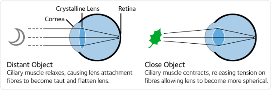 If you hold something near the nose, pupils get small (miosis), accommodate (flattening of lens) and converge (look towards nose)