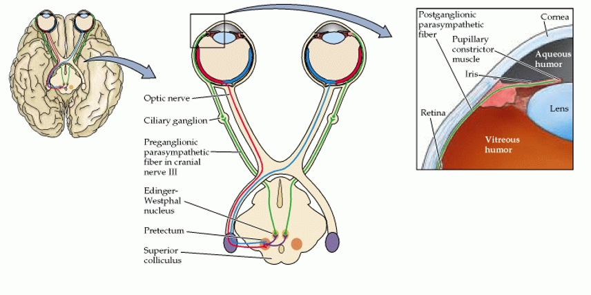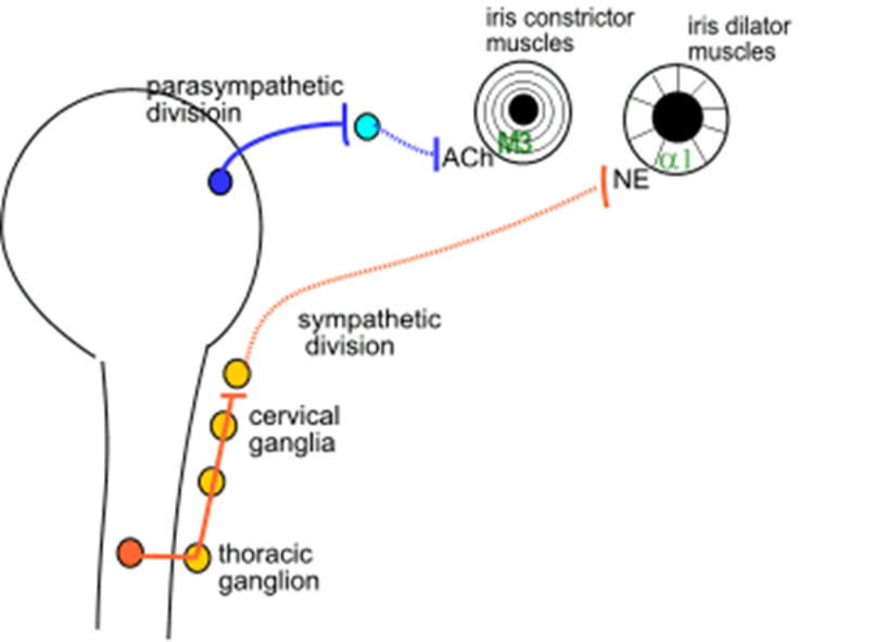 Sym - dilates the pupil (arousal / fear, need wider vision), starts in hypothalamus and has long journey