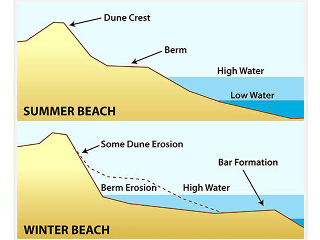 3) sadn will travel up the windward side creating a pile oof sand that will become so unstable and collapse