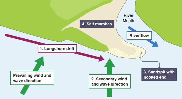 3) is the prevailing wind changes direction, a hook is formed at end of spit at distal end