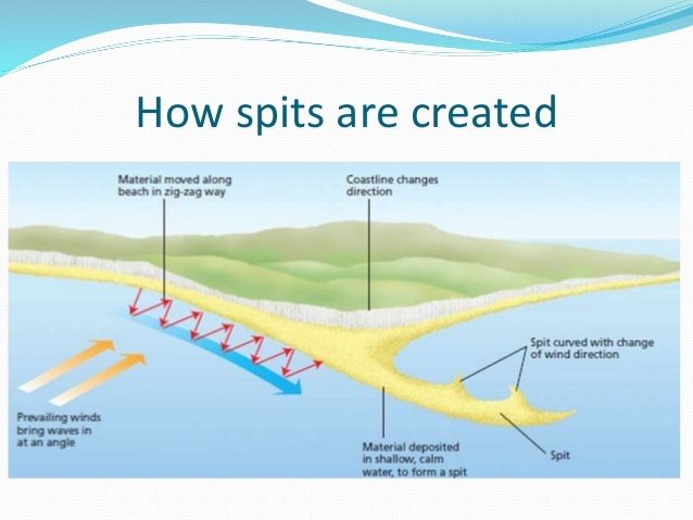1) coastline changes shape, waves lose energy and deposition occures at proximal end, spit projects out of land