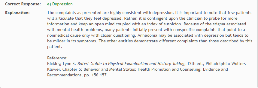 Feedback: Although you may consider referrals to help with the diagnosis and treatment for this patient, screening is a time-efficient way to recognize depression. This will allow her to be treated more expediently. You may tell the patient you have not found an answer yet, but you must also tell her that you will not stop looking until you have helped her.