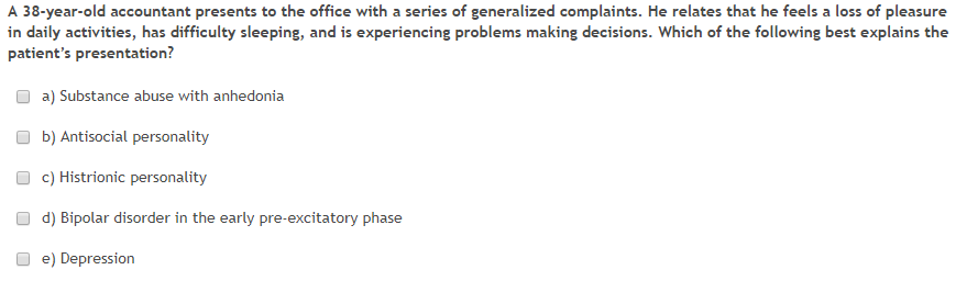 Feedback: Major depression occurs in a person with a previously normal state of mood. The symptoms often consist of a combination of sadness, decreased interest, sleeping problems (insomnia or hypersomnia), eating problems (decreased or increased appetite), feelings of guilt, decreased energy, decreased concentration, psychomotor changes (retardation or agitation), and a preoccupation with thoughts of death or suicide. There must be at least five symptoms for a diagnosis of major depression. This patient has six: (1) sadness, (2) trouble sleeping, (3) overeating, (4) fatigue, (5) difficulty with concentration, and (6) no interest in doing things.