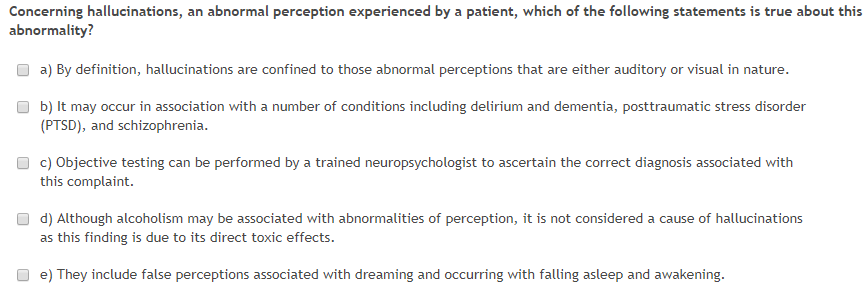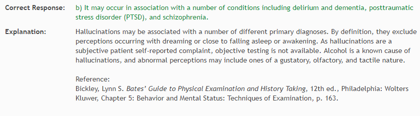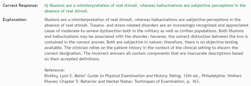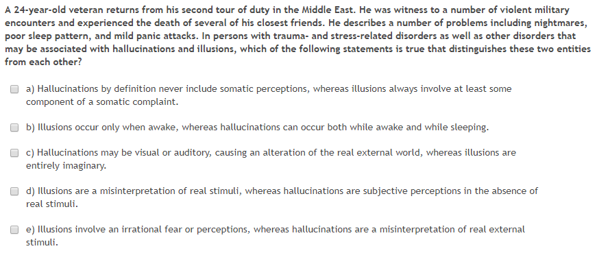 Feedback: A hallucination is a subjective sensory perception in the absence of real external stimuli. The patient can hear, see, smell, taste, or feel something that does not exist in reality. In this case, his sister has passed away and cannot be speaking to him, although in his mind he can hear her. This is an example of an auditory hallucination, but hallucinations can occur with any of the five senses.