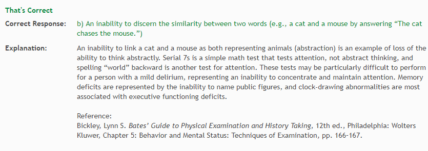 Feedback: This represents flight of ideas because the ideas are connected in some logical way. Derailment, or loosening of associations, has more disconnection within clauses. Circumstantiality is characterized by the patient speaking “around” the subject and using excessive detail, though thoughts are meaningfully connected. Incoherence lacks meaningful connection and often has odd grammar or word use. Although severe flight of ideas can produce this condition, evidence is not present in this vignette.
