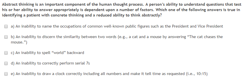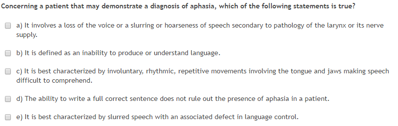 Feedback: You should suspect a visual problem because there is no writing on one half of the circle. This is consistent with a hemianopsia, sometimes seen in stroke. These patients may also eat food on only one half of their plate. The other conditions would not account for this pattern.