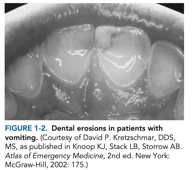 Patients typically present with severe weight loss (with body weight < 85% of ideal body weight) and clinical manifestations of multiple nutritional deficiencies. Despite being underweight, anorexic patients are obsessed with calories, preoccupied with dieting, and intensely fearful of gaining weight. Dental caries and erosions (Figure 1-2) may be present if patients are also inducing vomiting. Additional purging via laxative abuse may cause palpitations, lightheadedness, or chest pain due to electrolyte abnormalities.