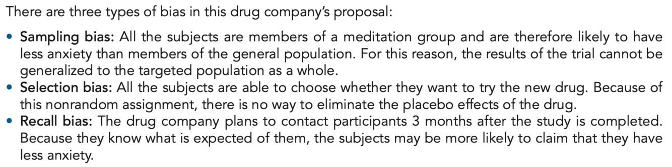 Bias refers to any source of error in the determination of association between the exposure (drug use, in this case) and outcome (reduction in anxiety, in this case).