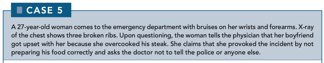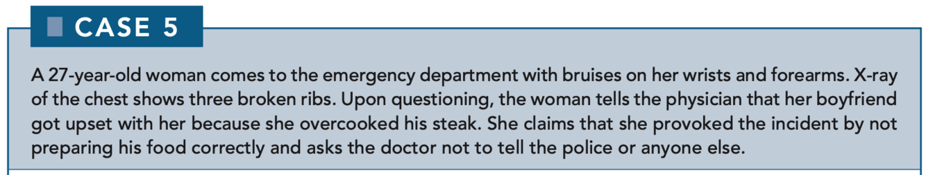 Because the patient is not considered to be a minor or an elderly patient (defined as being older than 65 years of age), the patient’s right to confidentiality must be respected. Although the physician should make all resources available to her, such as a battered women’s home, the ethical principles of patient autonomy and privacy must be followed.